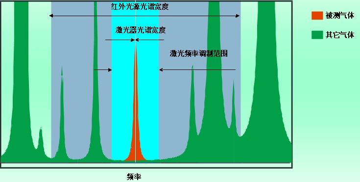 背景氣體的干擾 | 利用氣體分子的窄帶吸收特性,背景氣體吸收干擾小 | 很難高精度地定性定量校正背景氣體交叉干擾 | 利用半導(dǎo)體激光良好的單色性,采用“單線光譜”技術(shù)避免背景氣體吸收干擾 |